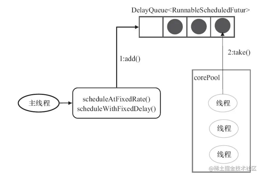 - 当调用ScheduledThreadPoolExecutor的scheduleAtFixedRate()方法或者scheduleWithFixedDelay()方法时,会向ScheduledThreadPoolExecutor的DelayQueue添加一个实现了RunnableScheduledFuture接口的ScheduledFutureTask 。