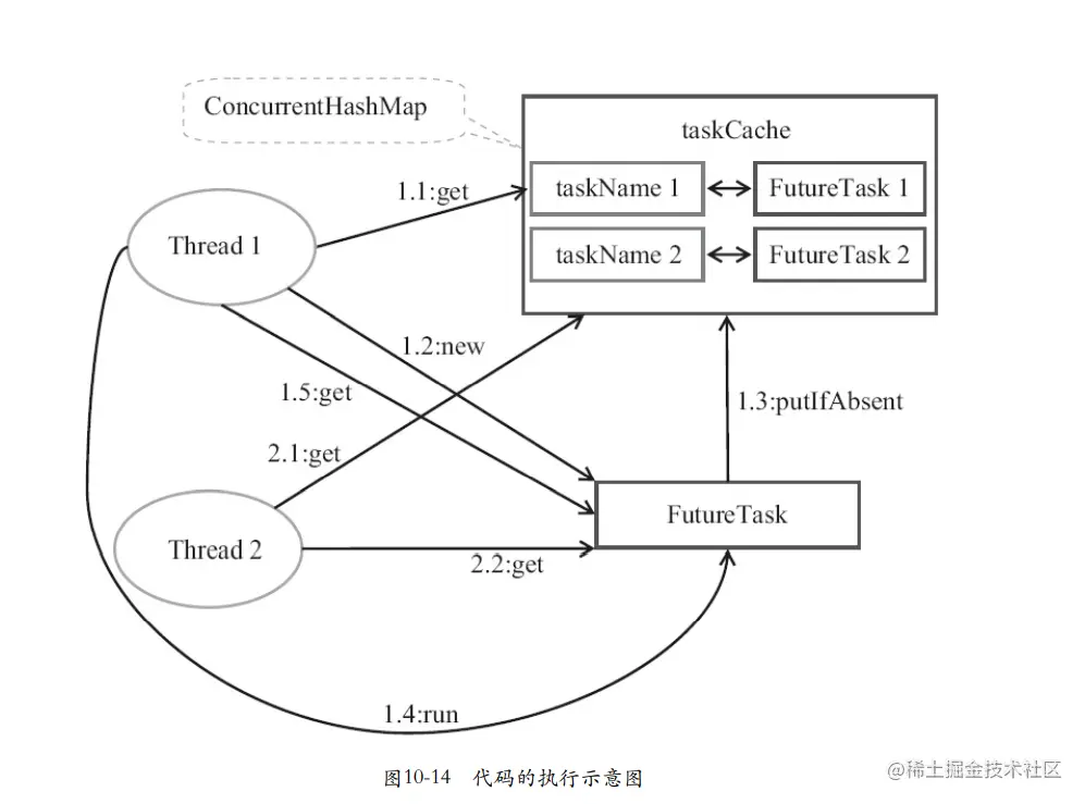 当两个线程试图同时执行同一个任务时,如果Thread 1执行1.3后Thread 2执行2.1,那么接下来Thread 2将在2.2等待,直到Thread 1执行完1.4后Thread 2才能从2.2 (FutureTask.get())返回。