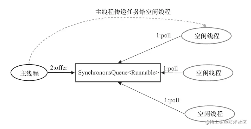 - 首先执行SynchronousQueue.offer (Runnable task)。如果当前maximumPool中有空闲线程正在执行
