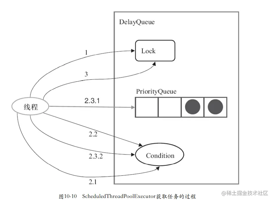 - 线程池中的线程从DelayQueue中获取ScheduledFutureTask,然后执行任务。