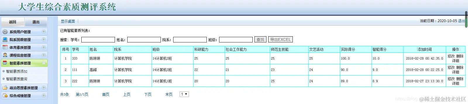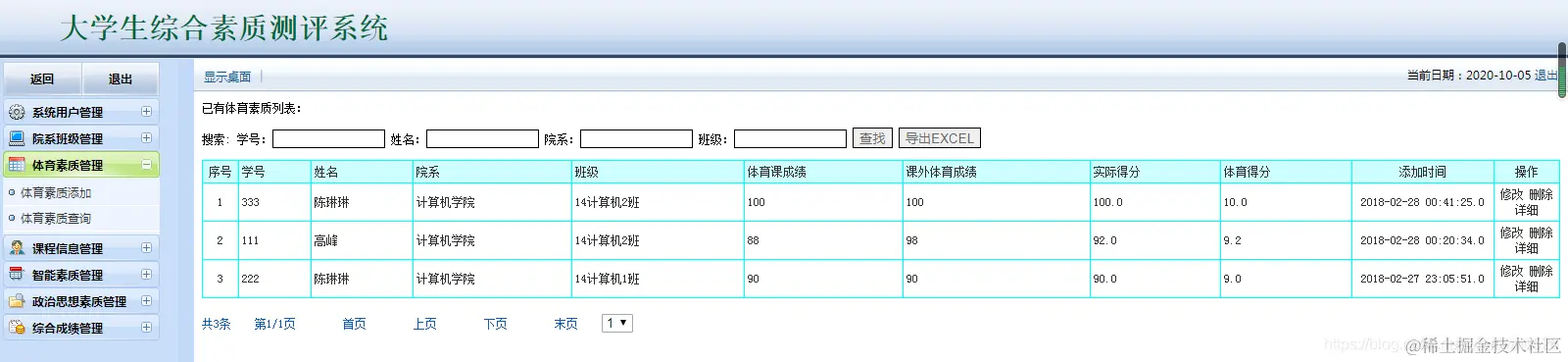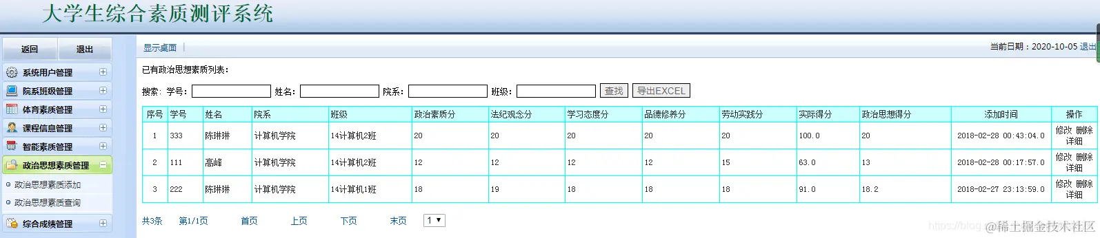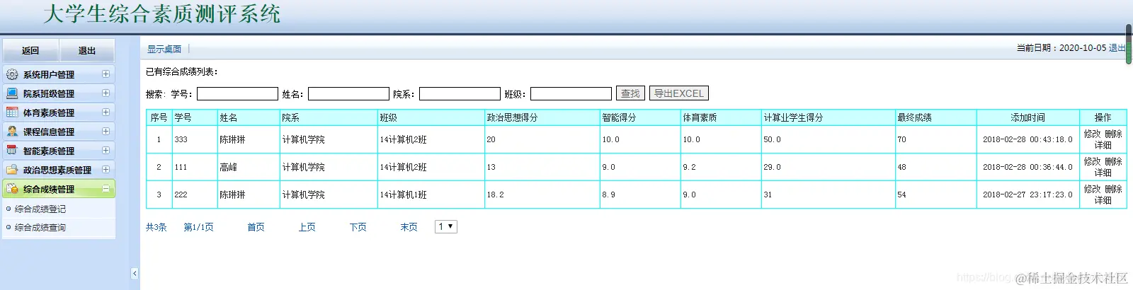 大学生综合素质测评系统:包含用户管理,学生管理,院系管理,课程管理,各种测评成 管理等,数据可以导出EXECL,分用管理员用户和学生用户,管理员管理信息,用户查看自己的成绩信息。