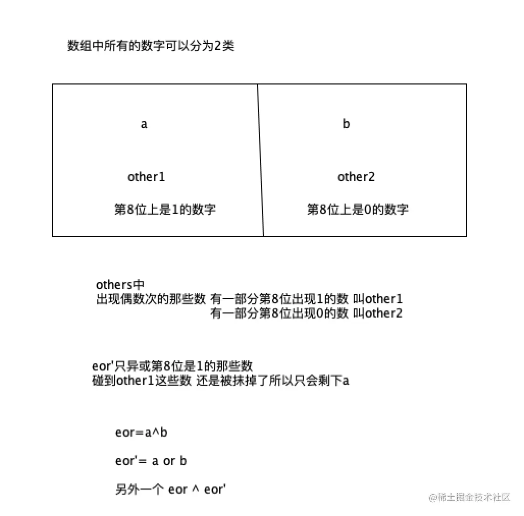 假设一个数组中 a和b 出现奇数次 其他的数字others都出现偶数次