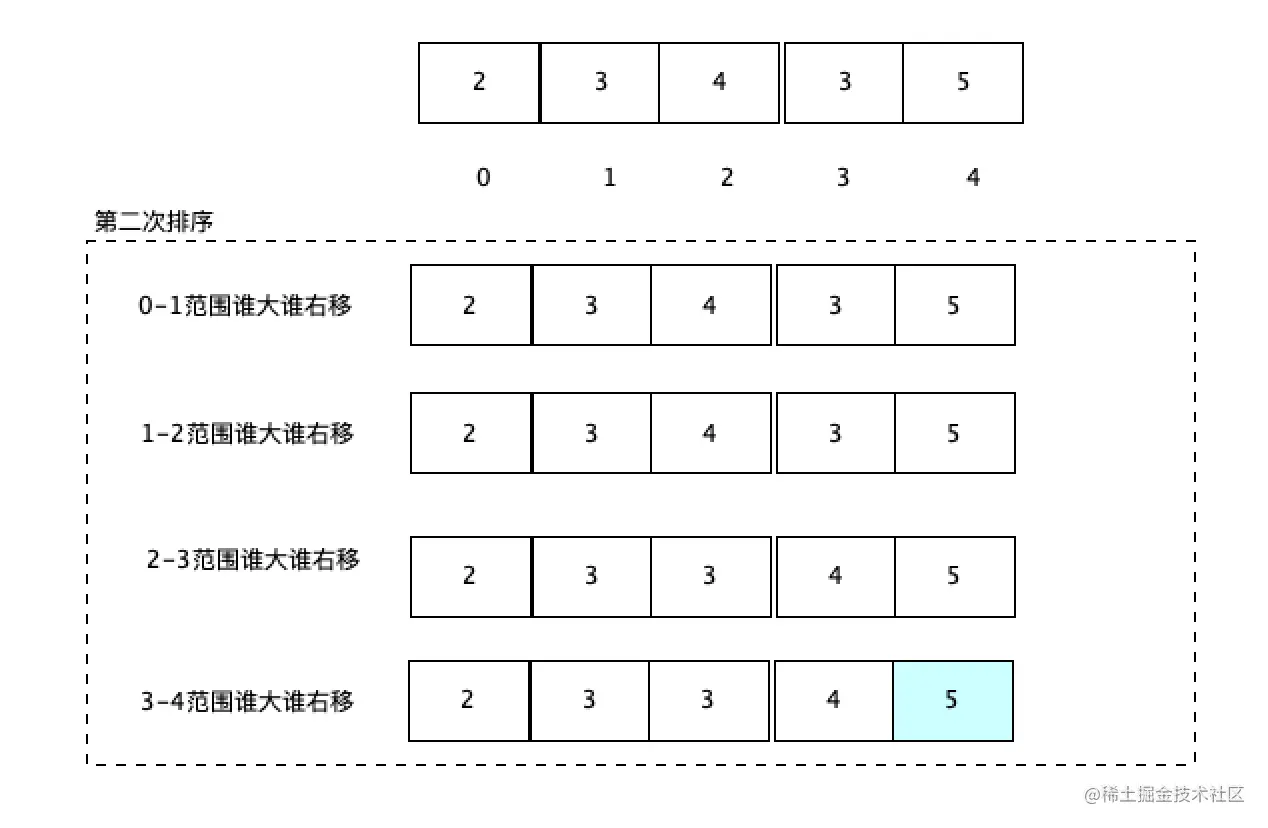 第二次排序在0~N-2个数上 确定了N-2位置上的数