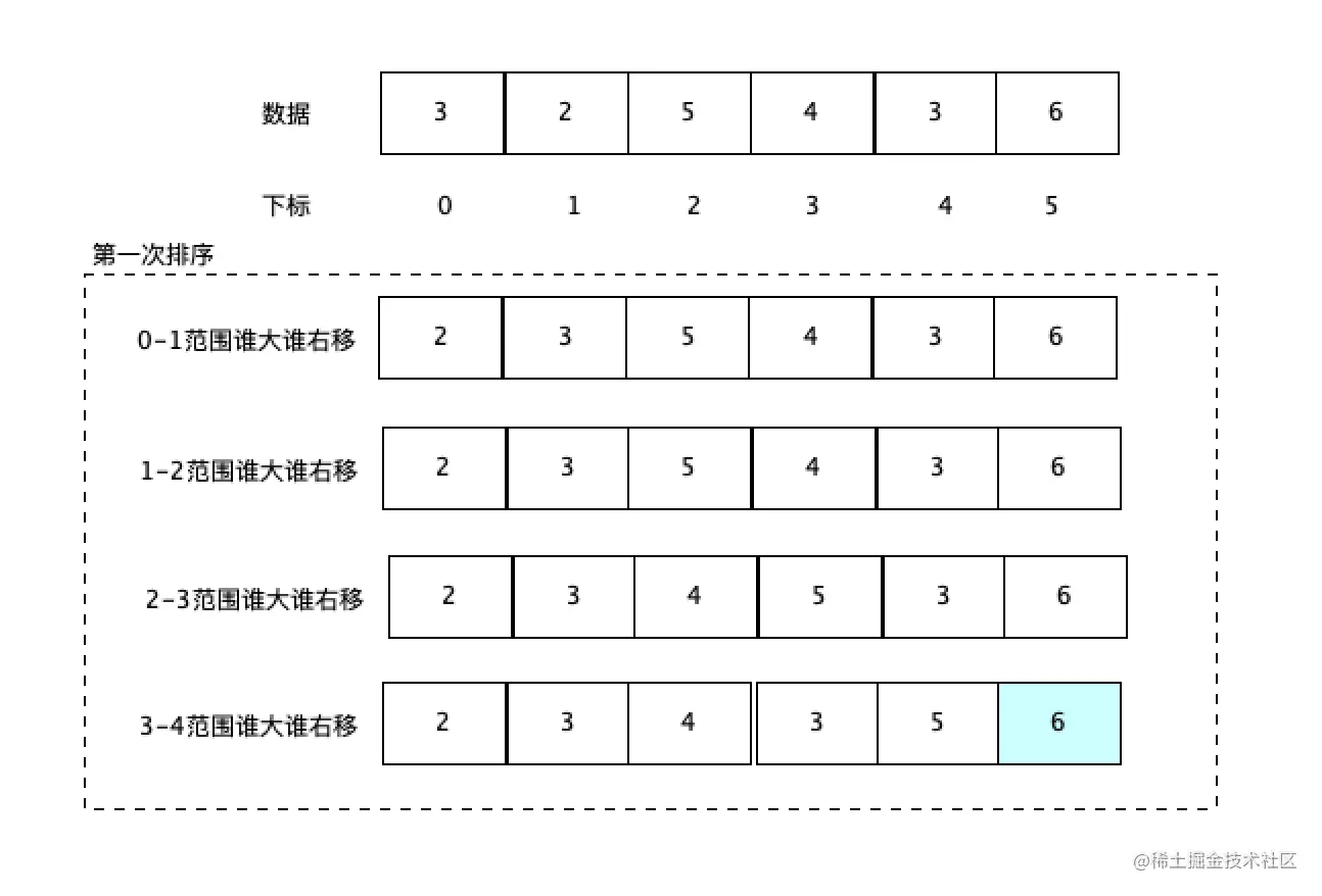 第一次排序遍历数组中所有的值即N次 第二次排序遍历N-1次 第三次排序遍历N-2次 第四次排序遍历N-3次