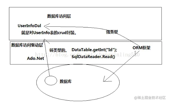 其实在上图中我们可以看出来使用了ORM的框架,使用的是强制类型,不容易出现错误,直接实现了由表实体到表的操作,而没有使用的ORM框架,我们需要数据库访问驱动层,Ado.NET操作数据,是一种弱类型的操作,非常容易出现错误。其实ORM框架的底层代码也是ADO.NET,只不过这些代码是封装好了的,直接可以被用户使用,非常方便!