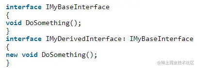 6、如果要隐藏继承了基接口的成员,可以用关键字new来定义它们。例如: