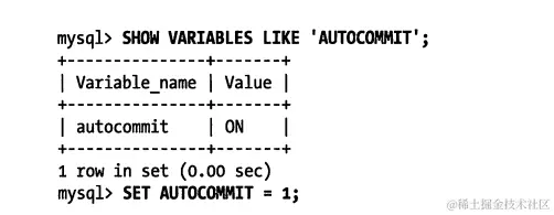 MySQL默认采用自动提交((AUTOCOMMIT)模式。也就是说,如果不是显式地开始一个事务,则每个查询都被当作一个事务执行提交操作。在当前连接中,可以通过设置AUTOCOMMIT变量来启用或者禁用自动提交模式: