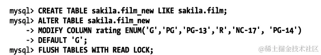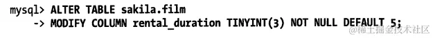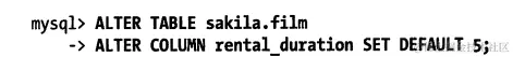 不是所有的 ALTER TABLE操作都会引起表重建。例如,有两种方法可以改变或者删除一个列的默认值(一种方法很快,另外一种则很慢)。假如要修改电影的默认租赁期限,从三天改到五天。下面是很慢的方式: