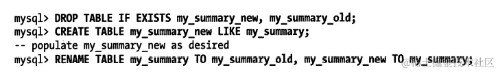 如果像上面的例子一样,在将my_summary这个名字分配给新建的表之前将原始的my_summary表重命名为my_summary_old,就可以在下一次重建之前一直保留旧版本的数据。如果新表有问题,则可以很容易地进行快速回滚操作。