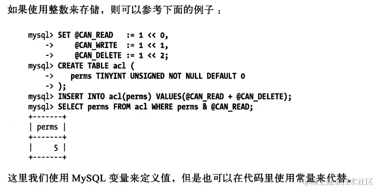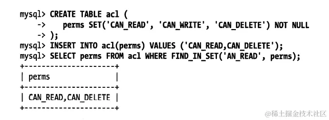 一个包装位的应用的例子是保存权限的访问控制列表(ACL)。每个位或者SET元素代表一个值,例如CAN_READ、CAN_WRITE,或者CAN_DELETE。如果使用SET列,可以让MySQL在列定义里存储位到值的映射关系﹔如果使用整数列,则可以在应用代码里存储这个对应关系。这是使用SET列时的查询: