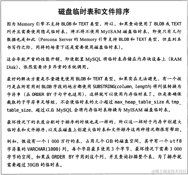 MySQL不能将BLOB和TEXT列全部长度的字符串进行索引,也不能使用这些索引消除排序。(关于这个主题下一章会有更多的信息。)