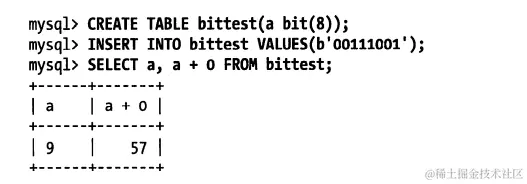 MySQL把BIT当作字符串类型,而不是数字类型。当检索BIT(1)的值时,结果是一个包含二进制0或1值的字符串,而不是ASCII码的“0”或“1”。 然而,在数字上下文的场景中检索时,结果将是位字符串转换成的数字。如果需要和另外的值比较结果,一定要记得这一点。例如,如果存储一个值b'00111001'(二进制值等于57)到BIT(8)的列并且检索它,得到的内容是字符码为57的字符串。也就是说得到ASCII码为57的字符“9”。但是在数字上下文场景中,得到的是数字57: