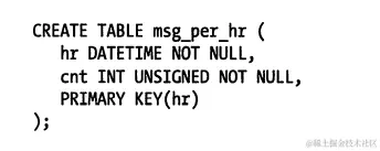 如果必须获得过去24小时准确的消息发送数量(没有遗漏),有另外一种选择。以每小时汇总表为基础,把前23个完整的小时的统计表中的计数全部加起来,最后再加上开始阶段和结束阶段不完整的小时内的计数。假设统计表叫作msg_per_hr并且这样定义: