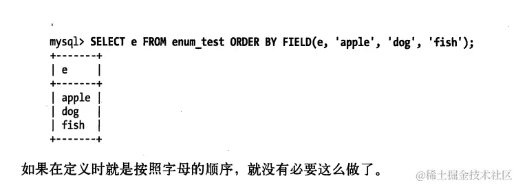 一种绕过这种限制的方式是按照需要的顺序来定义枚举列。另外也可以在查询中使用FIELD()函数显式地指定排序顺序,但这会导致MySQL无法利用索引消除排序。