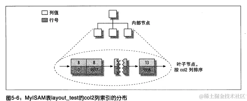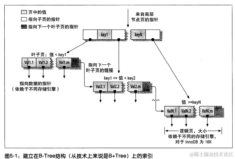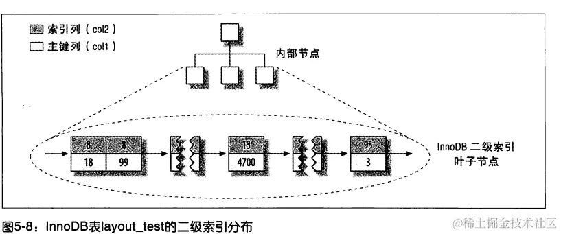 叶子节点比较特别,它们的指针指向的是被索引的数据,而不是其他的节点页(不同引擎的“指针”类型不同)。图5-1中仅绘制了一个节点和其对应的叶子节点,其实在根节点和叶子节点之间可能有很多层节点页。树的深度和表的大小直接相关。