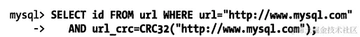 若删除原来URL列上的索引,而新增一个被索引的url_crc列,使用CRC32做哈希,就可以使用下面的方式查询: