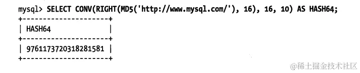 如果数据表非常大,CRC32()会出现大量的哈希冲突,则可以考虑自己实现一个简单的64位哈希函数。这个自定义函数要返回整数,而不是字符串。一个简单的办法可以使用MD5()函数返回值的一部分来作为自定义哈希函数。这样实现最简单:
