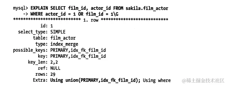 MySQL5.0和更新版本引入了一种叫“索引合并”(index merge)的策略,一定程度上可以使用表上的多个单列索引来定位指定的行。在MySQL 5.0和更新的版本中,查询能够同时使用这两个单列索引进行扫描,并将结果进行合并。这种算法有三个变种:OR条件的联合(union),AND条件的相交( intersection),组合前两种情况的联合及相交。下面的查询就是使用了两个索引扫描的联合,通过EXPLAIN中的Extra列可以看到这点: