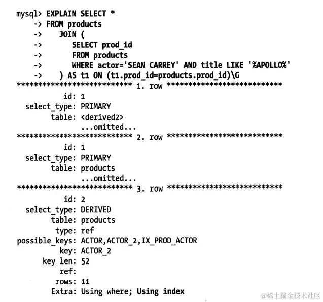 MySQL会使用这类技术优化复杂查询,所以在某些语句的Extra列中还可以看到嵌套操作。