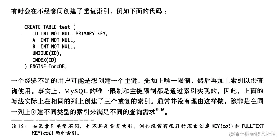重复索引是指在相同的列上按照相同的顺序创建的相同类型的索引。应该避免这样创建重复索引,发现以后也应该立即移除。