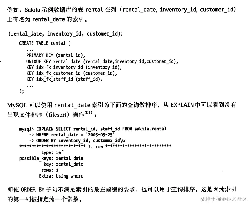 有一种情况下ORDER BY子句可以不满足索引的最左前缀的要求,就是前导列为常量的时候。如果WHERE子句或者JOIN子句中对这些列指定了常量,就可以“弥补”索引的不足。