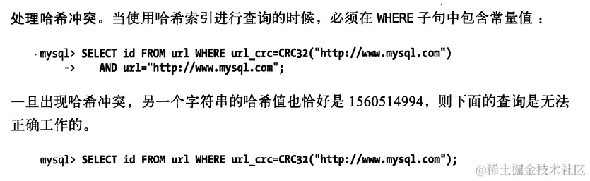 这样做的性能会非常高,因为MySQL优化器会使用这个选择性很高而体积很小的基于url_crc列的索引来完成查找(在上面的案例中,索引值为1560514994)。即使有多个记录有相同的索引值,查找仍然很快,只需要根据哈希值做快速的整数比较就能找到索引条目,然后一一比较返回对应的行。另外一种方式就是对完整的URL字符串做索引,那样会非常慢。