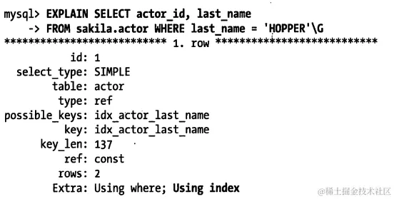 例如,sakila.actor使用InnoDB存储引擎,并在last_name字段有二级索引,虽然该索引的列不包括主键actor_id,但也能够用于对actor_id做覆盖查询: