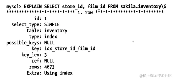 当发起一个被索引覆盖的查询(也叫做索引覆盖查询)时,在 EXPLAIN的Extra列可以看到“Using index”的信息。例如,表sakila.inventory有一个多列索引(store_id,film_id)。MySQL 如果只需访问这两列,就可以使用这个索引做覆盖索引,如下所示: