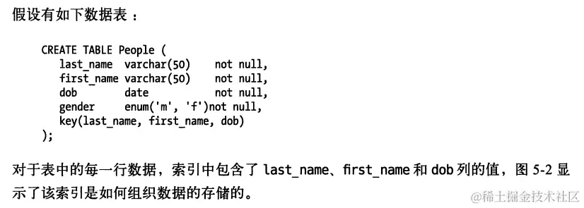 请注意,索引对多个值进行排序的依据是CREATE TABLE 语句中定义索引时列的顺序。看一下最后两个条目,两个人的姓和名都一样,则根据他们的出生日期来排列顺序。