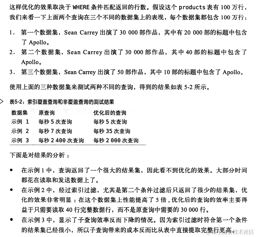 索引覆盖查询还有很多陷阱可能会导致无法实现优化。MySQL查询优化器会在执行查询前判断是否有一个索引能进行覆盖 。假设索引覆盖了WHERE条件中的字段,但不是整个查询涉及的字段。如果条件为假(false),MySQL 5.5和更早的版本也总是会回表获取数据行, 尽管并不需要这一行且最终会被过滤掉。