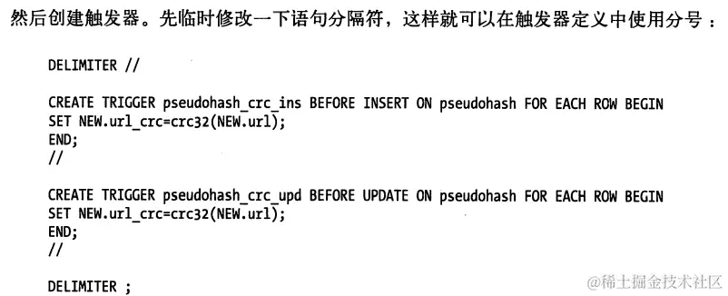 这样实现的缺陷是需要维护哈希值。可以手动维护,也可以使用触发器实现。下面的案例演示了触发器如何在插入和更新时维护url_crc列: