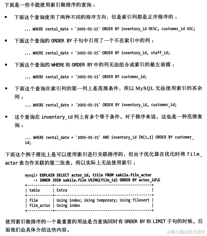 只有当索引的列顺序和ORDER BY子句的顺序完全一致,并且所有列的排序方向(倒序或正序)都一样时,MySQL才能够使用索引来对结果做排序。如果查询需要关联多张表,则只有当ORDER BY子句引用的字段全部为第一个表时,才能使用索引做排序。 ORDER BY子句和查找型查询的限制是一样的:需要满足索引的最左前缀的要求(即ORDER BY子句的条件的前导列为索引最左列?)﹔否则,MySQL都需要执行排序操作,而无法利用索引排序。