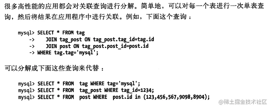 - 在应用层做关联,可以更容易对数据库进行拆分,更容易做到高性能和可扩展。查询本身效率也可能会有所提升。这个例子中,使用IN()代替关联查询,可以让MySQL按照ID顺序进行查询,这可能比随机的关联要更高效。我们后续将详细介绍这点。