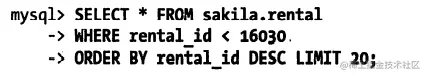 假设上面的查询返回的是主键为16 049到16 030的租借记录,那么下一页查询就可以从16 030这个点开始: