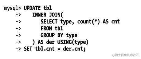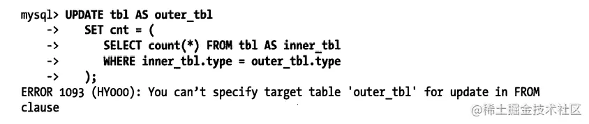 可以通过使用生成表的形式来绕过上面的限制,因为MySQL 只会把这个表当作一个临时表来处理。实际上,这执行了两个查询:一个是子查询中的SELECT语句,另一个是多表关联UPDATE,只是关联的表是一个临时表。子查询会在UPDATE语句打开表之前就完成,所以下面的查询将会正常执行: