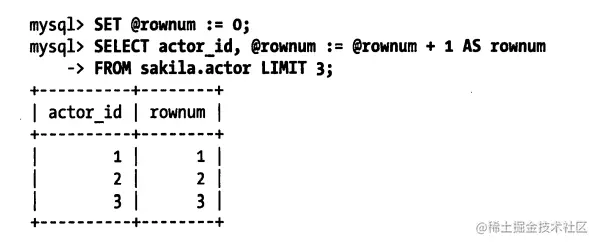 使用用户自定义变量的一个重要特性是你可以在给一个变量赋值的同时使用这个变量。下面的例子展示了如何使用变量来实现一个类似“行号(row number)”的功能: