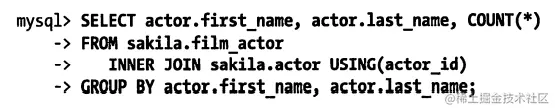 mysql> SELECT actor_id,COUNT(*)FROM sakila.film_actor GROUP BY actor_id;