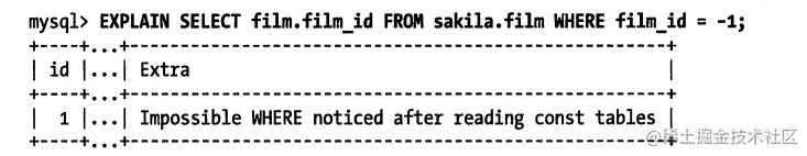 - 从数据表中返回数据,然后过滤不满足条件的记录(在Extra列中出现UsingWhere)。这在MySQL服务器层完成,MySQL需要先从数据表读出记录然后过滤。