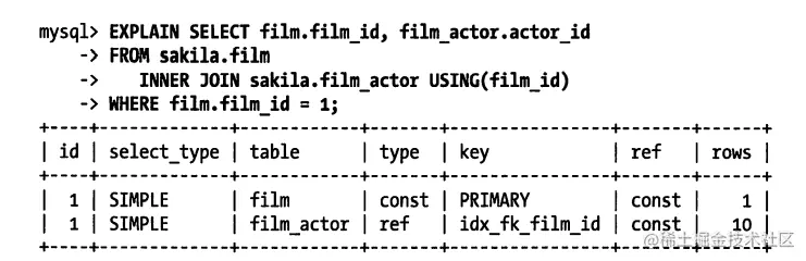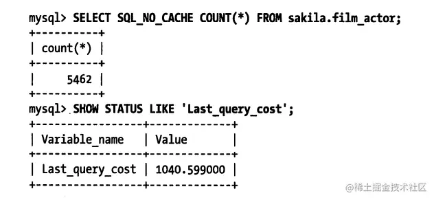 这个结果表示MySQL的优化器认为大概需要做1040个数据页的随机查找才能完成上面的查询。这是根据一系列的统计信息计算得来的:每个表或者索引的页面个数、索引的基数(索引中不同值的数量)、索引和数据行的长度、索引分布情况。优化器在评估成本的时候并不考虑任何层面的缓存,它假设读取任何数据都需要一次磁盘IO。
