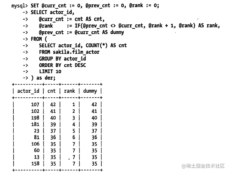 对数据进行排名的问题也与此类似,但往往还会同时和GROUP BY混合使用。在这种情况下通常都需要预先计算并存储排名信息。