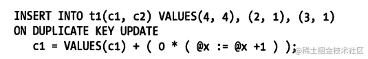 当每次由于冲突导致更新时对变量@x自增一次。然后通过对这个表达式乘以0来让其不影响要更新的内容。另外,MySQL 的协议会返回被更改的总行数,所以不需要单独统计这个值。