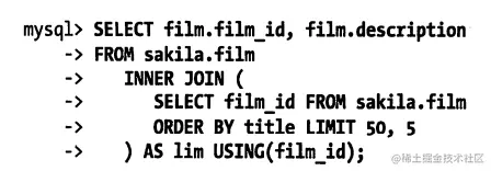 这里的“延迟关联”将大大提升查询效率,它让 MySQL扫描尽可能少的页面,获取需要访问的记录后再根据关联列回原表查询需要的所有列。这个技术也可以用于优化关联查询中的LIMIT子句。