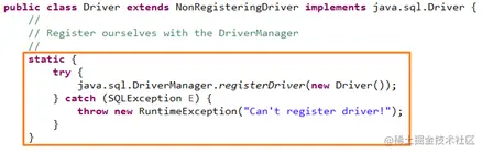 - 通常不用显式调用 DriverManager 类的 registerDriver() 方法来注册驱动程序类的实例,因为 Driver 接口的驱动程序类都包含了静态代码块,在这个静态代码块中,会调用 DriverManager.registerDriver() 方法来注册自身的一个实例。下图是MySQL的Driver实现类的源码: