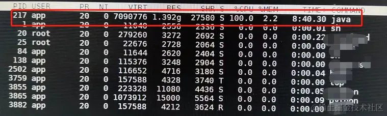 首先先看系统负载情况,使用top命令查看。发现其中某个Java进程cpu一直持续停留在100%到200%之间。因为这个系统不涉及大量运算的逻辑,所以可以猜到要不就是死循环的问题,要不就是频繁full gc导致。