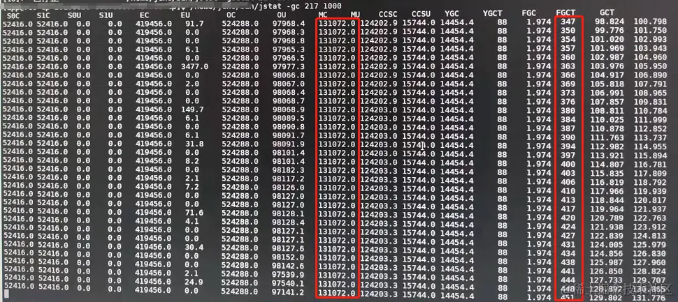 其中还有另一个参数 MC(元空间分配内存大小),已经接近设置的最大元空间大小(配置的--XX:MaxMetaspaceSize=128m)。