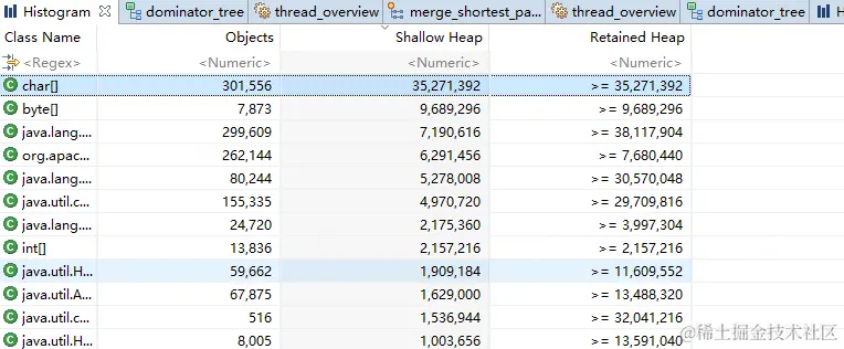 在Histogram视图中,选中其中一个类点击鼠标右键会弹出一个菜单,选择Merge shortest paths to GC Roots,查看当前对象到GC Root的路径,可以过滤一些类型的引用。