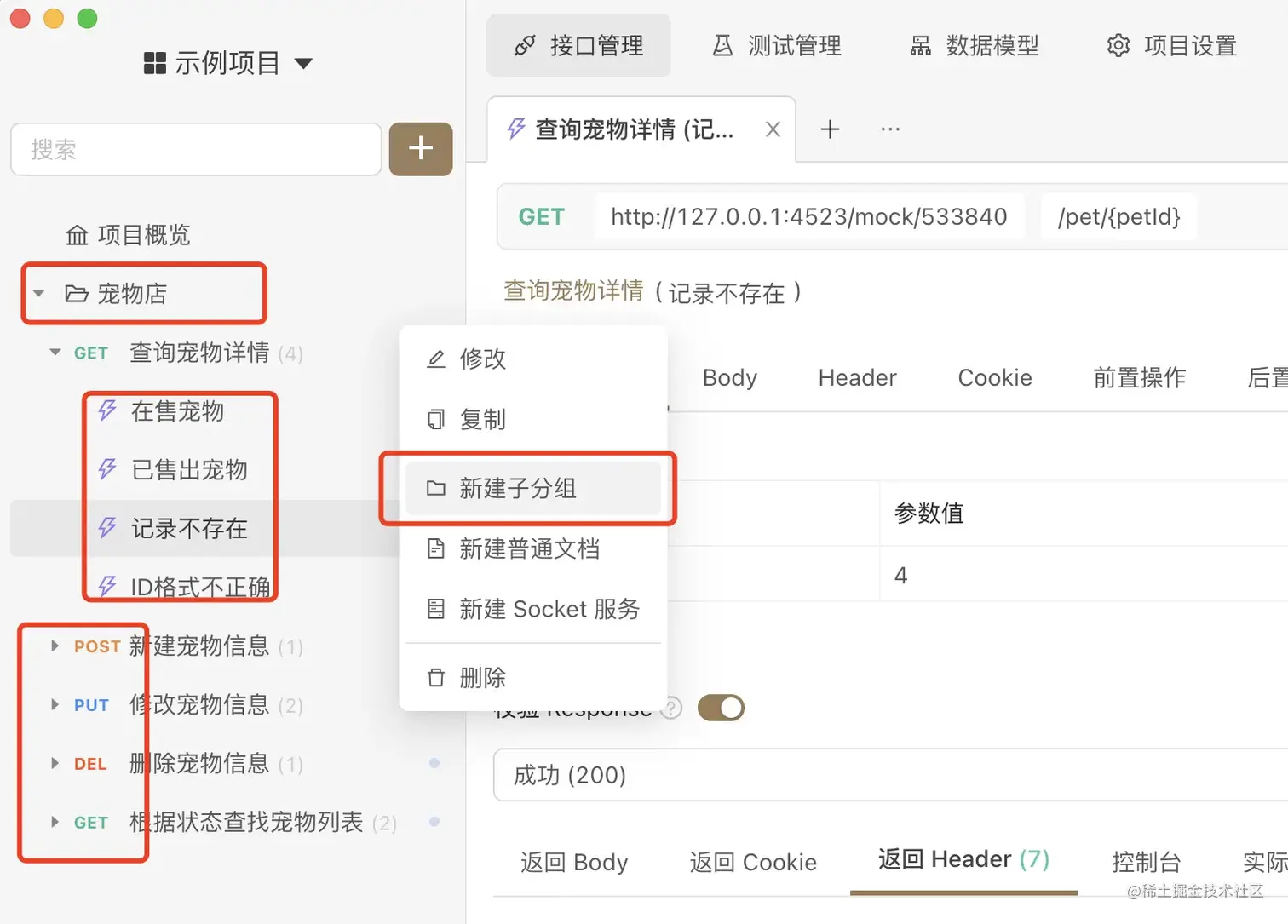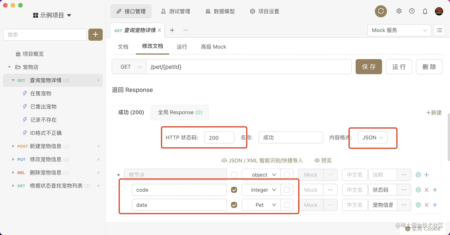 - 实例: 对应一个请求不同的参数以及响应,用于 Mock Server 以及文档。