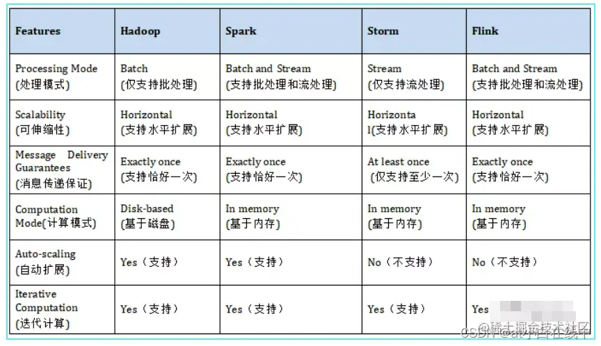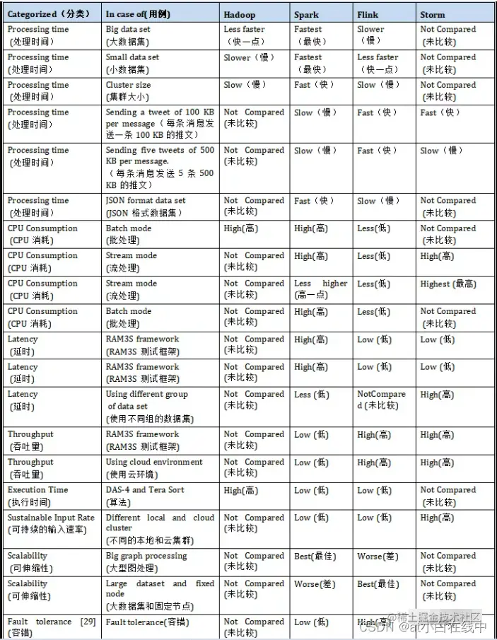 与Apache Hadoop和Apache Storm框架相比,在非实时数据中Spark为多个KPI(包括处理时间,CPU消耗,延迟,执行时间,任务性能和可伸缩性)的赢家。在流处理中Flink与Apache Spark和Apache Storm框架相比,Flink在处理时间,CPU消耗,延迟,吞吐量,执行时间,任务性能,可伸缩性和容错能力方面最适合流处理。