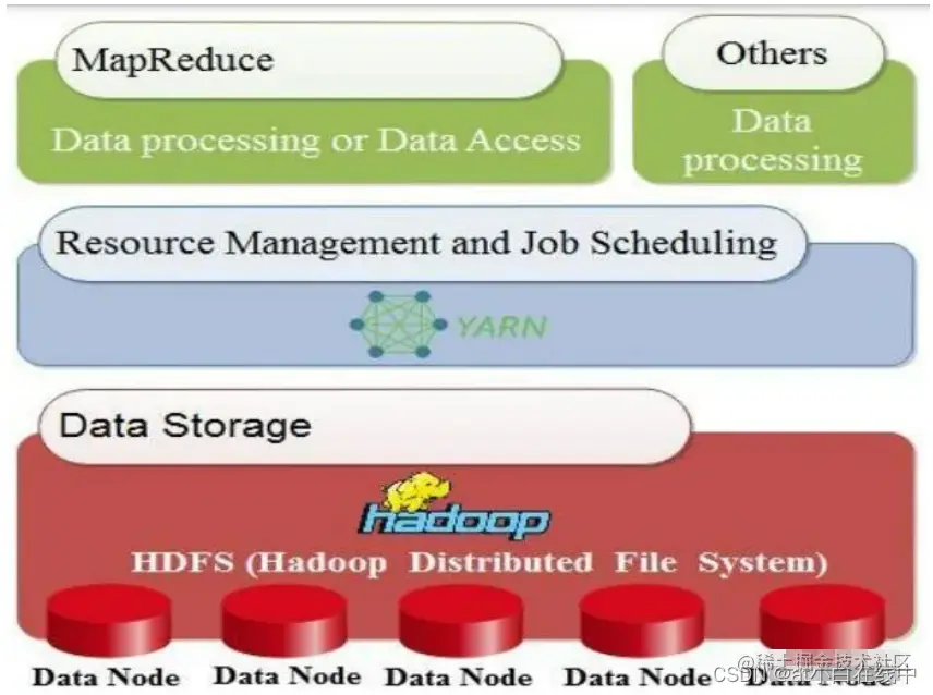 图2 说明了Hadoop框架的三个主要层。第一个是用于收集数据的数据存储层,其中包含Hadoop分布式文件系统(HDFS)。第二层是YARN基础结构,它提供用于作业调度的算术资源,例如CPU和内存。第三个是MapReduce,它用于与其他进程一起处理数据(软件层)。