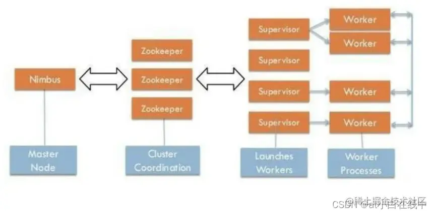 图5说明了两种类型的节点:第一种是主节点,第二种是工作节点。主节点用于监视故障,承担分布式节点的责任并为每台计算机指定每个任务。所有这些任务统称为Nimbus,类似于Hadoop的Job-Tracker。工作节点称为主管。当Nimbus为它分配特定的进程时,它将起作用。因此,拓扑的每个子过程都可与许多分布式计算机一起使用。Zookeeper扮演Nimbus与主管之间的协调员。更重要的是,如果任何集群出现故障,它将把任务重新分配给另一个任务。因此,从节点控制自己任务的执行。